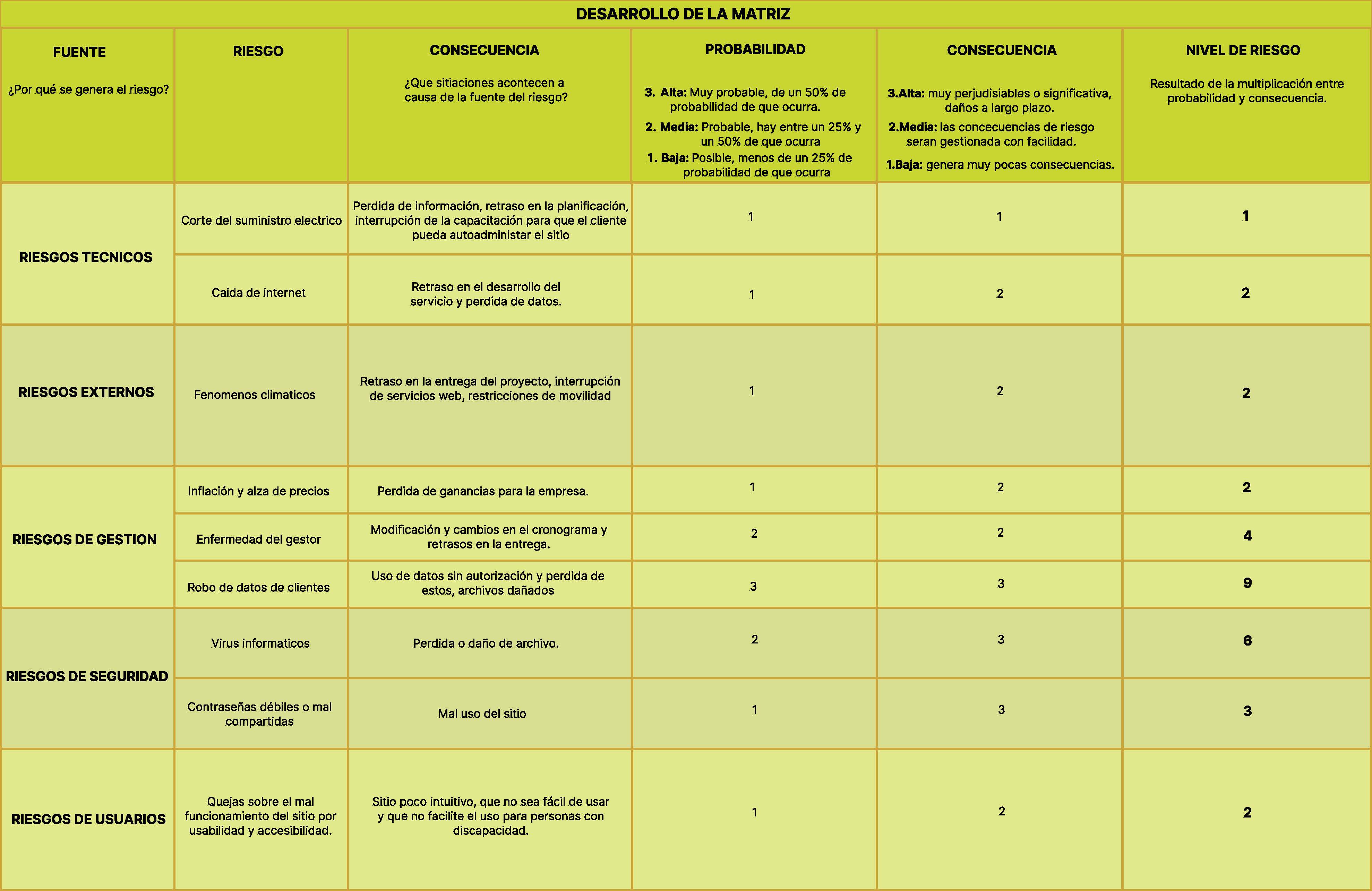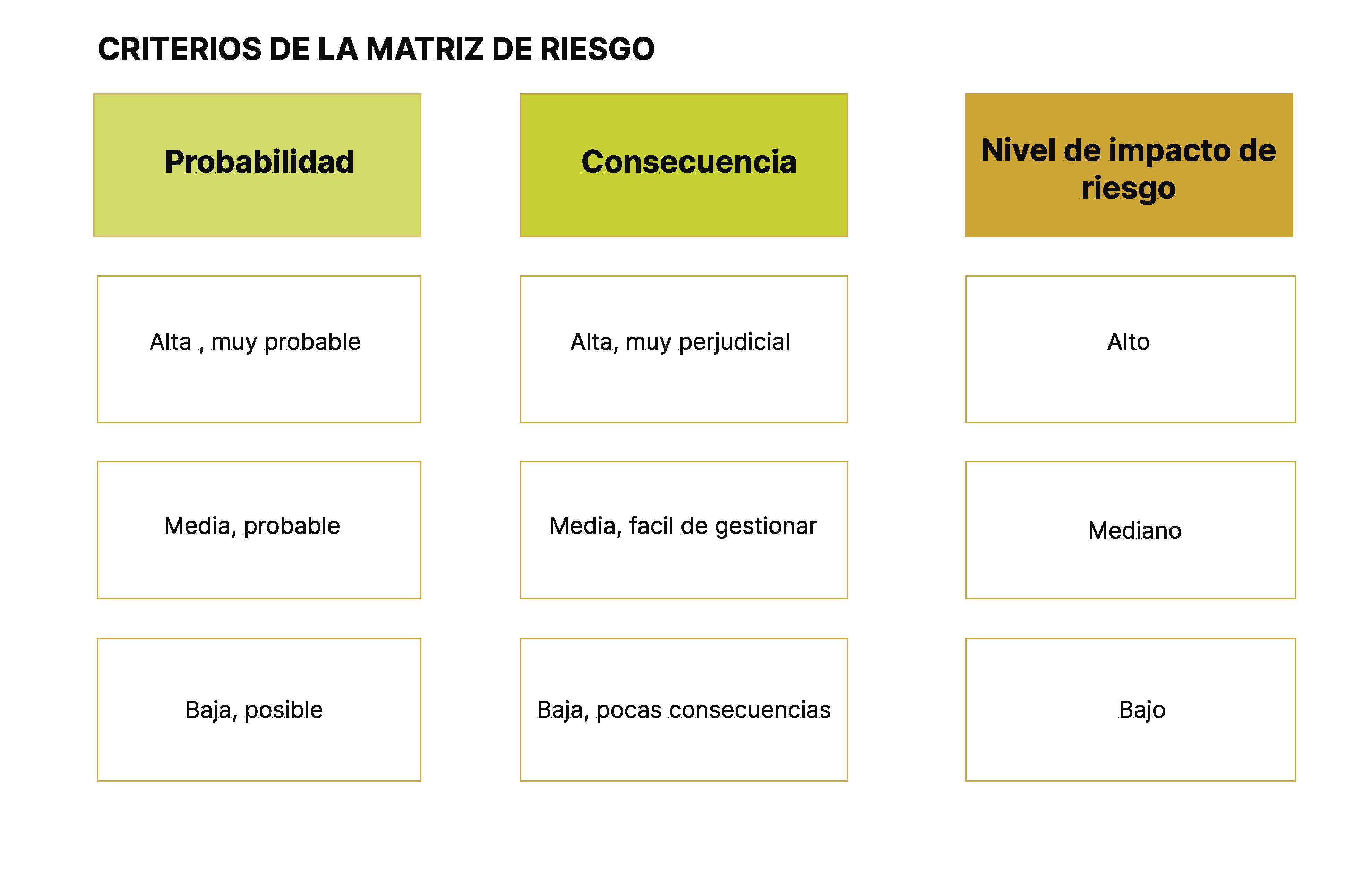 La matriz de riesgo calculado es una herramienta para comprender, analizar y gestionar los riesgos de un proyecto. Su desarrollo comienza con la identificación y clasificación de los riesgos, permitiendo reconocer los eventos que podrían afectar los resultados. Luego se evalúan los criterios principales de la matriz, la probabilidad de ocurrencia y la consecuencia o impacto de cada riesgo. Con esto, se calcula el nivel de riesgo, facilitando la toma de decisiones informada. Así, la matriz se convierte en una herramienta visual y analítica que promueve la planificación preventiva, ayudando a reducir los impactos negativos y asegurar el éxito del proyecto. Descargar Excel