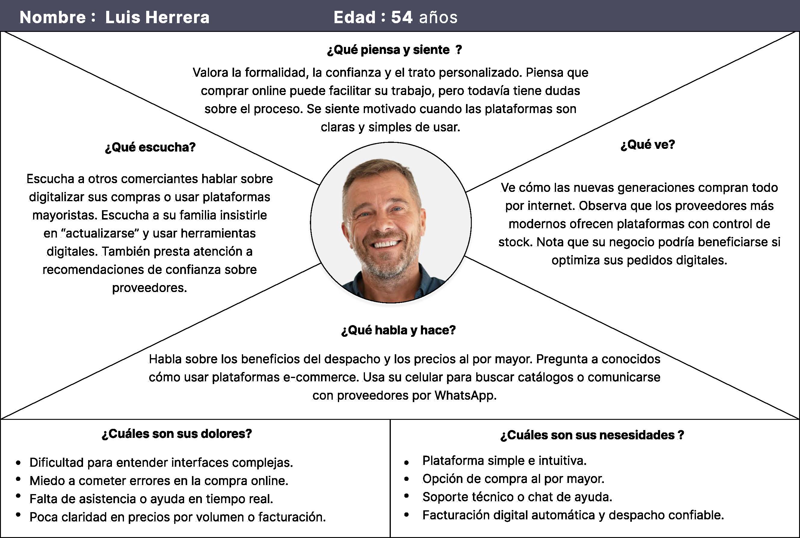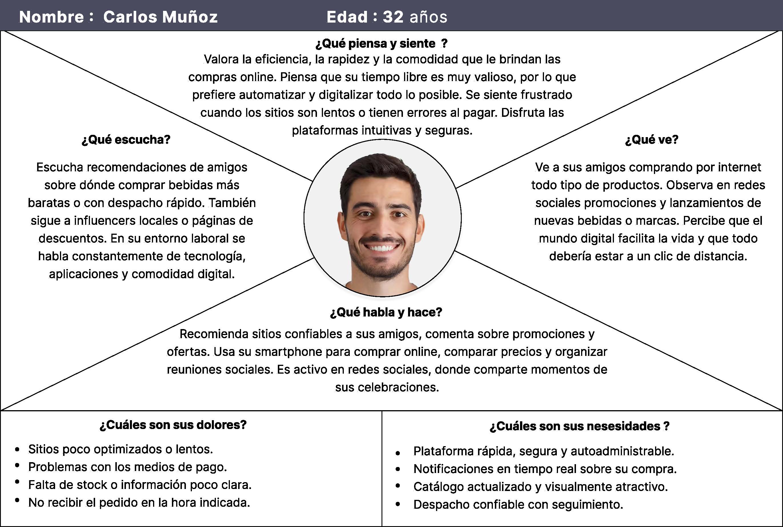 El público objetivo está compuesto por clientes locales y recurrentes, principalmente hombres y mujeres entre 25 y 55 años, que valoran la comodidad, rapidez y confianza en sus compras online. Este segmento busca un proceso de compra fácil, con entrega a domicilio y precios actualizados.